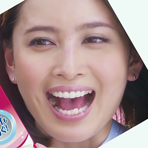下顎は相変わらず黄色く凸凹の自歯のままだが、上顎にずらりとラミネートベニア(貼り歯)を獅子舞の歯のように真っ白で四角い歯を加藤夏希は隙間なく平行に並べているので入れ歯のように見えていた (画像は32歳時)。